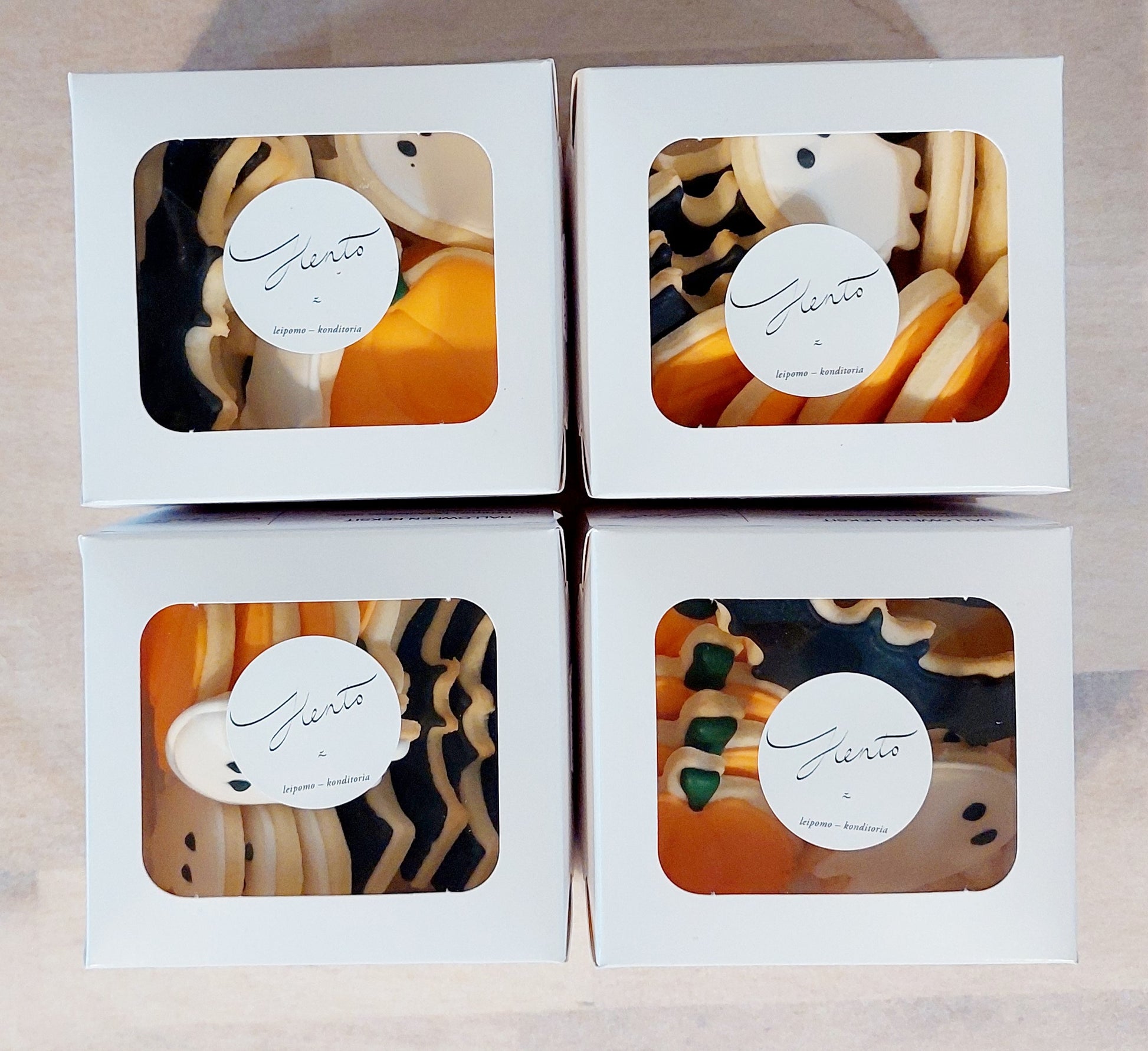 Muropohjaiset Halloween -aiheiset piparit koristeltuna sokerikuorrutteella.
